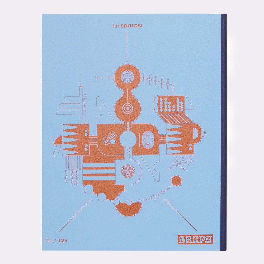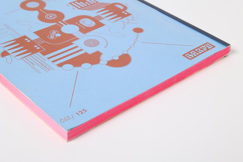 Hand-stamped and stickered spine and inside covers